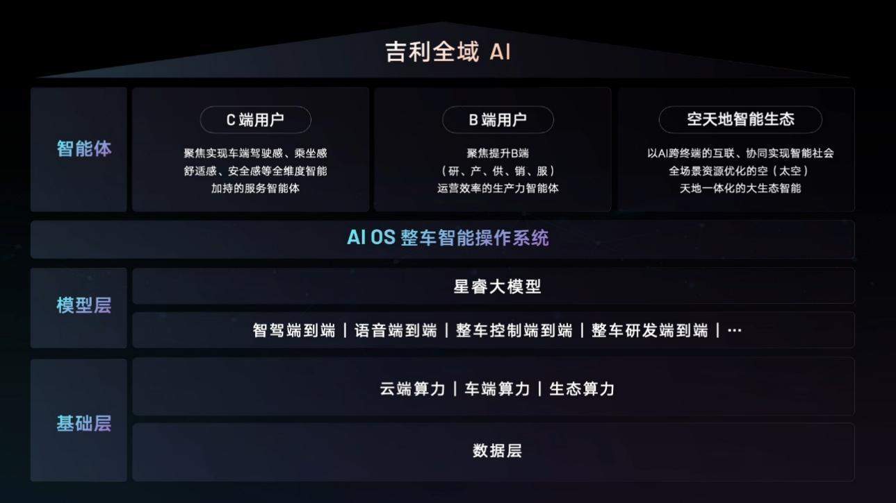 吉利高度關(guān)注智能汽車與AI技術(shù)的融合與應(yīng)用,并構(gòu)建了覆蓋C端消費(fèi)者、B端企業(yè)服務(wù)以及空天地一體的智能生態(tài)的“智能汽車全域AI”技術(shù)體系。相比單純的車端AI應(yīng)用的范疇,吉利的智能汽車全域AI覆蓋的范圍更廣、內(nèi)容也更豐富。
