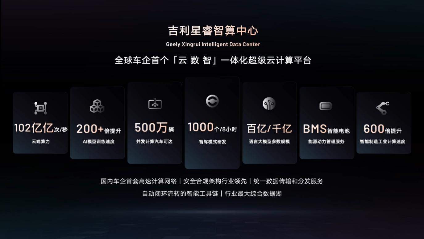 在算力領(lǐng)域,吉利建成了行業(yè)首個(gè)“云數(shù)智一體”超級(jí)智算中心——吉利星睿智算中心,并完成了行業(yè)首個(gè)智能計(jì)算中心管理流程的認(rèn)證。目前,吉利星睿智算中心的云端總算力已迭代到102億億次/秒,賦予車云一體BMS系統(tǒng)AI算力支撐和云端實(shí)時(shí)安全保護(hù),可支持500萬(wàn)在線車輛的智算需求。