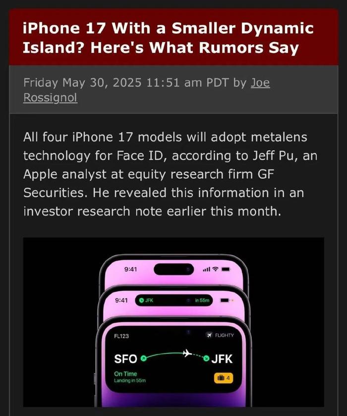 依然是來自@JeffPu的爆料,這次他表示,金屬超構透鏡技術不單單只是在Pro Max上配備,而是覆蓋iPhone 17全系。按照該爆料人的最新說法,iPhone 17全系四款機型都將采用更小的靈動島設計。