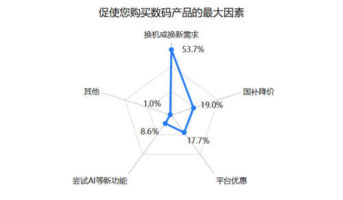 京東618期間消費者購3C數(shù)碼產(chǎn)品可享國補疊加以舊換新,4折起換新機,又好又便宜的購機體驗得到消費者廣泛認可。國補也成為促使消費者購買3C數(shù)碼產(chǎn)品的因素之一。調(diào)查結(jié)果顯示,促使消費者購買3C數(shù)碼產(chǎn)品的最大因素是換機或換新需求,占比為53.7%,因“國補降價”而選擇購買的占比超過15%。