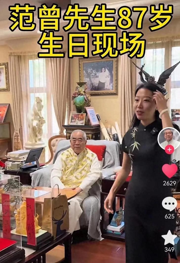 范老爺子在客廳沙發(fā)上笑容滿面,助理獻(xiàn)花增添喜慶。87歲高齡的他白發(fā)蒼蒼,卻氣色紅潤(rùn),眉毛烏黑,穿金色繡花中式西裝和布鞋,融合傳統(tǒng)與樸實(shí)。