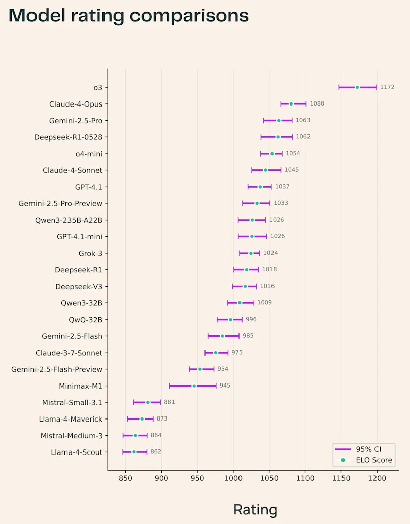 例如,o4-mini比GPT-4.1高出 2.9%,DeepSeek-R1也小勝自家模型DeepSeek-V3。