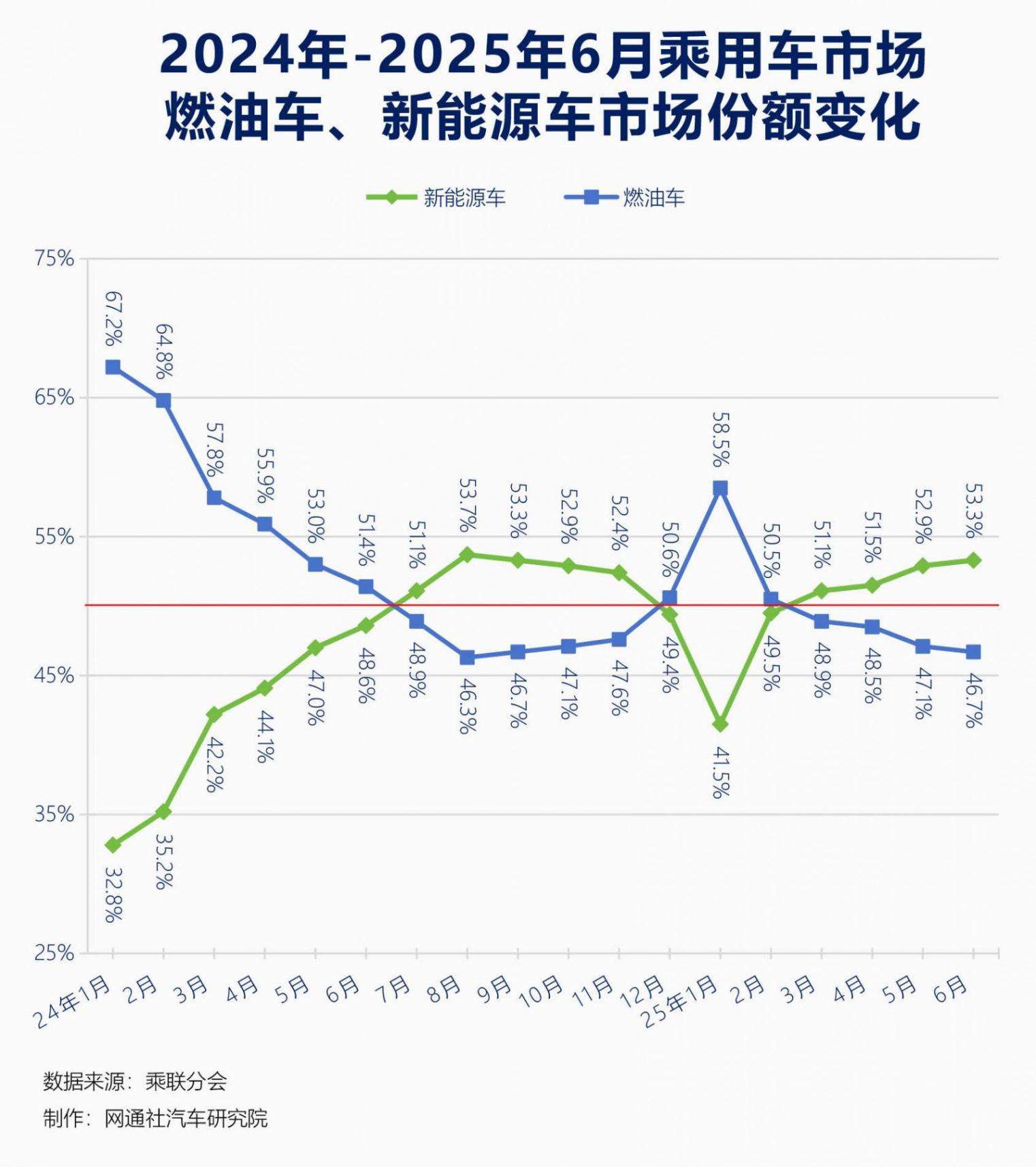 2024年,新能源車的月度滲透率首次突破50%;今年,半年度滲透率突破了50%。