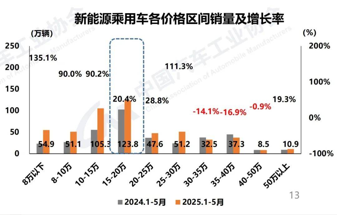 2025年1-5月中國新能源乘用車各價格區間銷量及增長率(中國汽車工業協會)