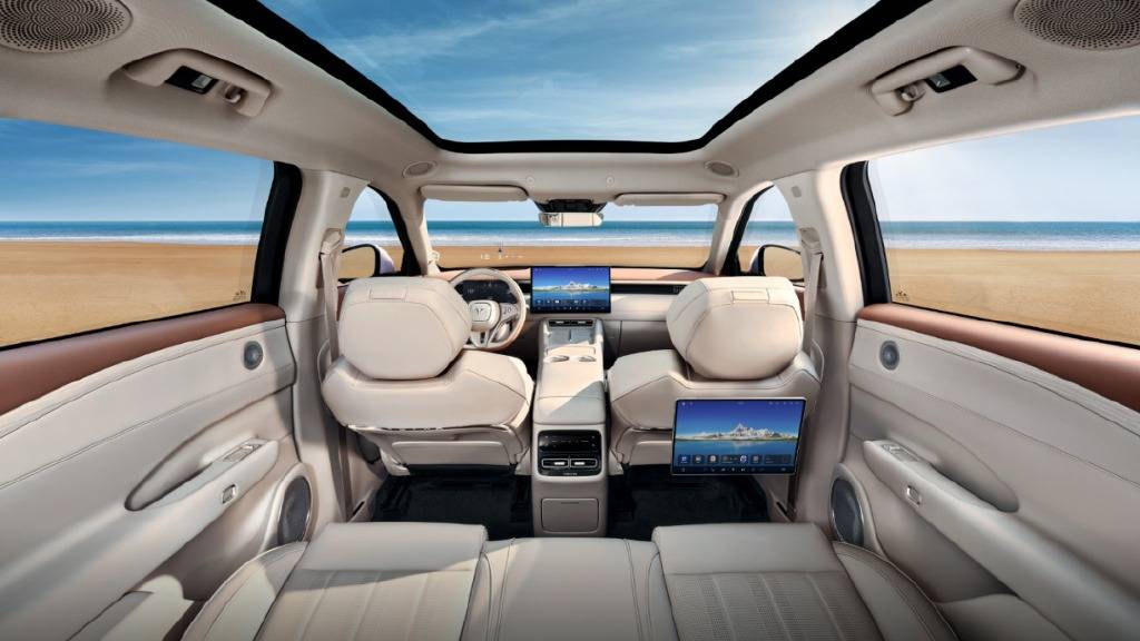 唐L DM則以中國古代建筑中的廡殿構(gòu)型為靈感,通過線條的勾勒,在中控臺、門板等部位呈現(xiàn)出“脊梁”般的視覺效果,展現(xiàn)出獨特的中式豪華氣質(zhì)。座椅采用2+3+2的七座布局,一、二排座椅標(biāo)配通風(fēng)、加熱、按摩功能,一排座椅還能放平與二排拼接形成大床,三排座椅靠背則是可以實現(xiàn)翻折收納,為后備廂提供更大的空間。配合雙開門寬溫域冷暖兩用智能車載冰箱、智能香氛,整體舒適度和嵐圖FREE+相差無幾,不過這兩個配置不是全系標(biāo)配,體驗門檻稍高。