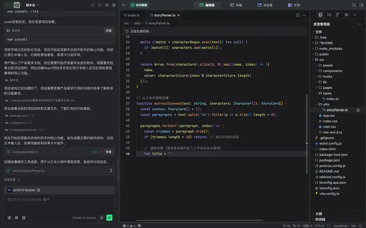 在獲得我們確認(rèn)后,它便開始了自主構(gòu)建。看著終端里自動(dòng)滾動(dòng)的npm install日志和編輯器里新增文件目錄 ,確實(shí)有種指揮AI干活的“爽感”。