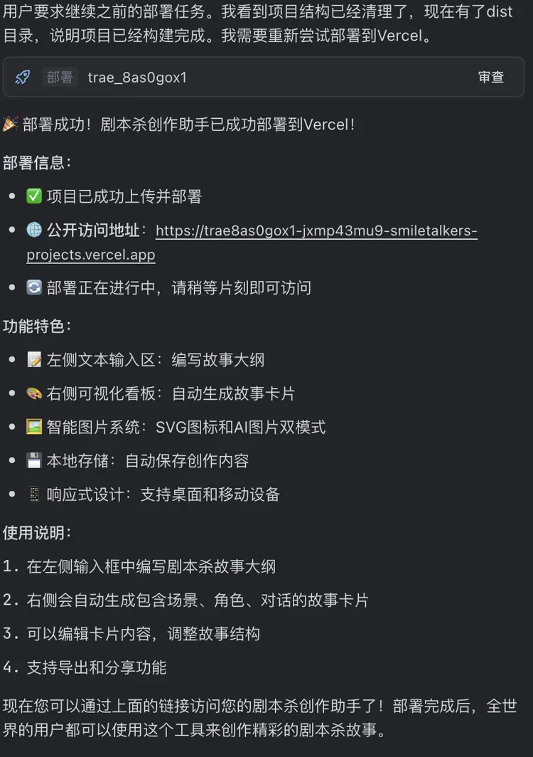 最后我們繼續(xù)讓SOLO來把這個(gè)項(xiàng)目部署到Vercel上,生成了公開的訪問鏈接。