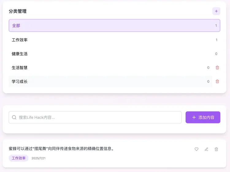 在完成了核心功能的開發(fā)和修復(fù)后,我們進(jìn)行了最后的驗(yàn)收,測(cè)試自定義內(nèi)容功能是否可用。進(jìn)入了后臺(tái)的內(nèi)容管理”面,手動(dòng)添加了一條關(guān)于蜜蜂的冷知識(shí):蜜蜂可以通過擺尾舞向同伴傳遞食物來源的精確位置信息。