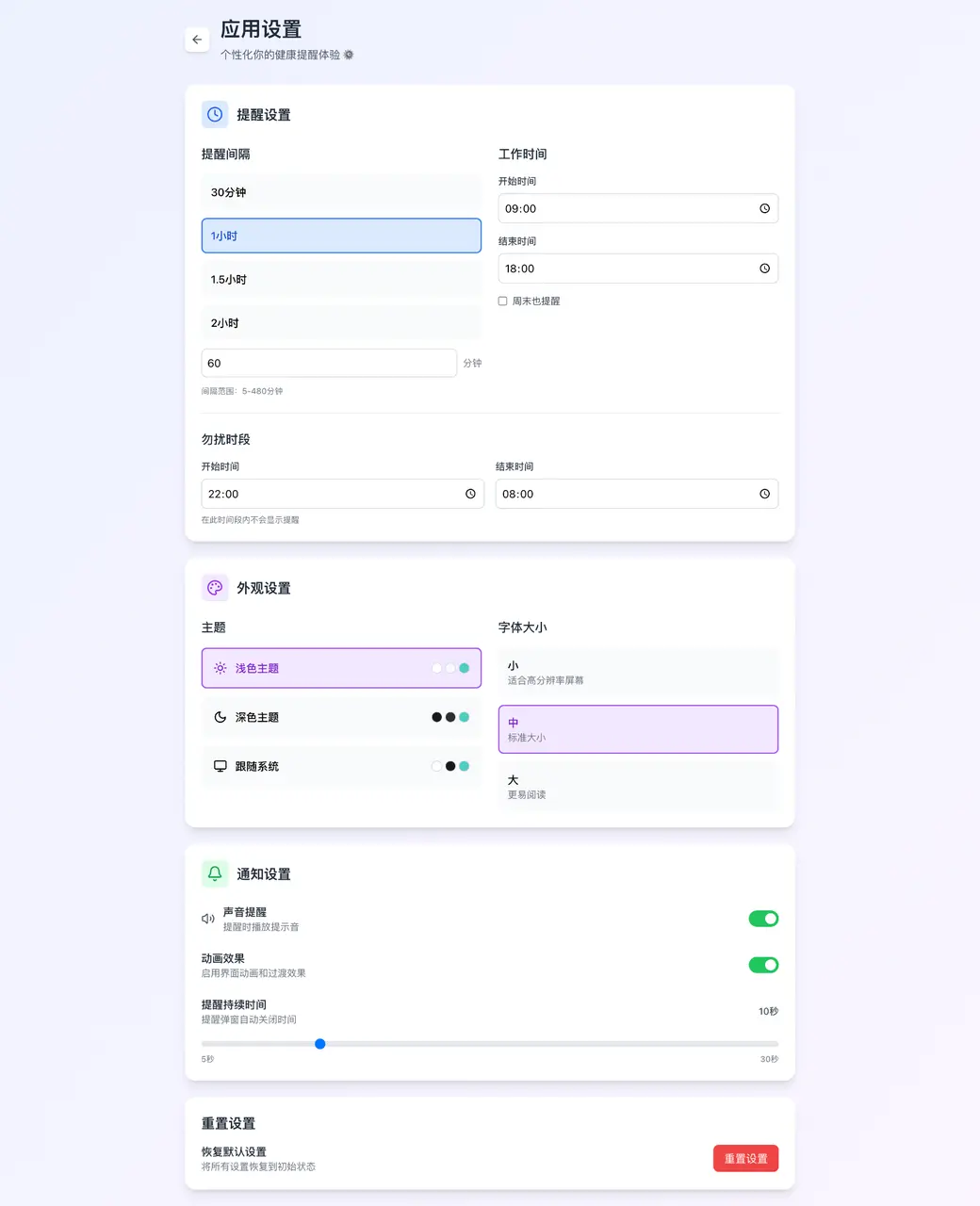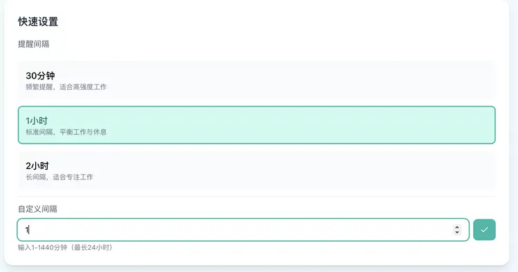 不只是一個(gè)簡單的計(jì)時(shí)器,而是一個(gè)功能相當(dāng)完備的Web App。有儀表盤、快捷設(shè)置、獨(dú)立的“內(nèi)容管理”后臺(tái)(用來管理提醒時(shí)彈出的文案內(nèi)容),甚至還有非常細(xì)致的應(yīng)用設(shè)置,可以調(diào)整主題、字體大小和通知聲音 。整個(gè)UI的設(shè)計(jì)語言清爽現(xiàn)代。