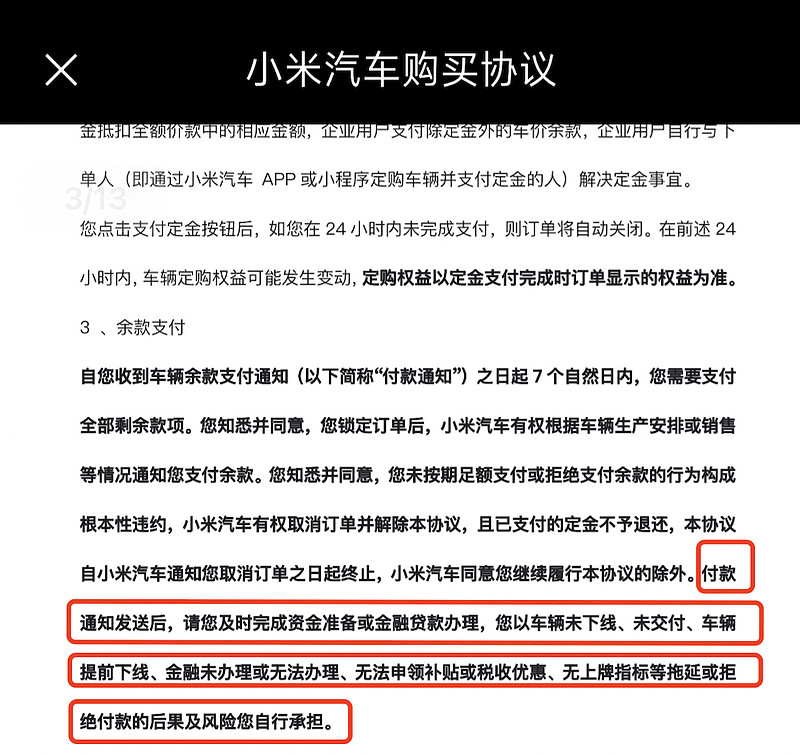小米汽車的購車協議揭示了引發爭議的源頭。合同中明確規定:小米有權基于“車輛生產安排或銷售情況”隨時要求支付尾款。