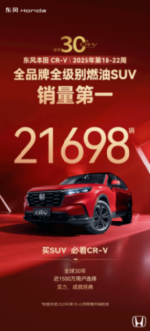 此外,東風本田在燃油車領域建樹頗豐。東風本田CR-V獲得2025年第18-22周全品牌全級別燃油SUV銷量第一。