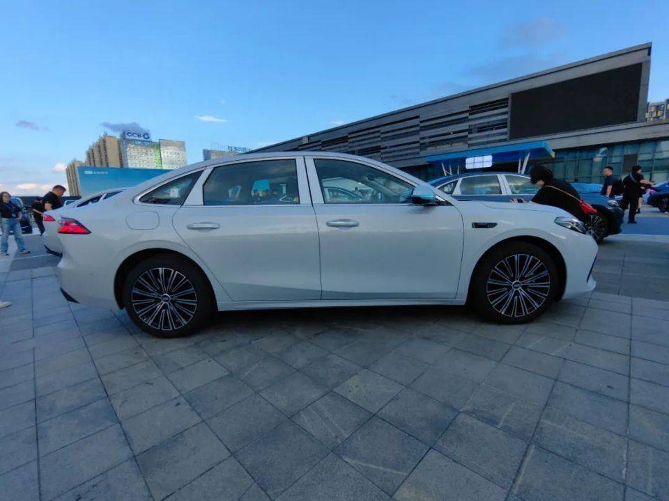 來到車身側(cè)面,采用溜背式車頂線條,一體貫穿式肩線設(shè)計,使用傳統(tǒng)式門把手,俯沖式的腰線,車窗相對狹長。根據(jù)車型不同,提供17英寸多輻輪圈、18英寸低風(fēng)阻輪圈和19英寸多輻輪圈三種選擇。車身尺寸方面,新車長寬高分別為4918/1905/1495mm,軸距2845mm。新車風(fēng)阻系數(shù)僅為0.229Cd。