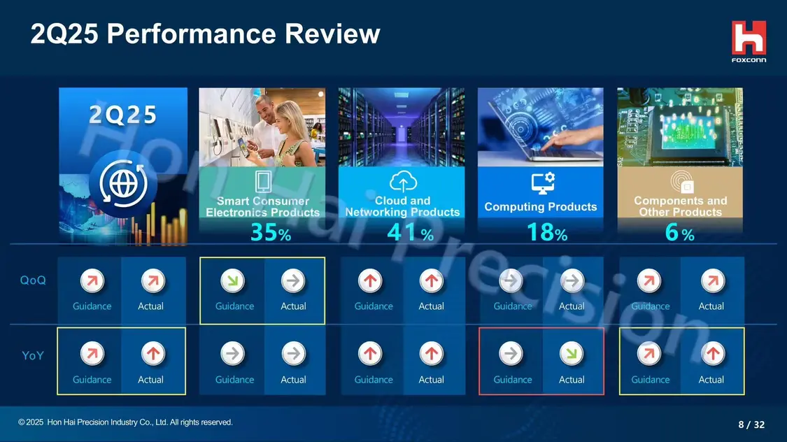 8 月 15 日消息,鴻海(富士康)昨日公布了 2025 年第二季度財務報告,營收 1.79 兆新臺幣(現匯率約合 4278.87 億元人民幣)同比增長 16% 創新高,連同盈利與凈利等均創當季新高。