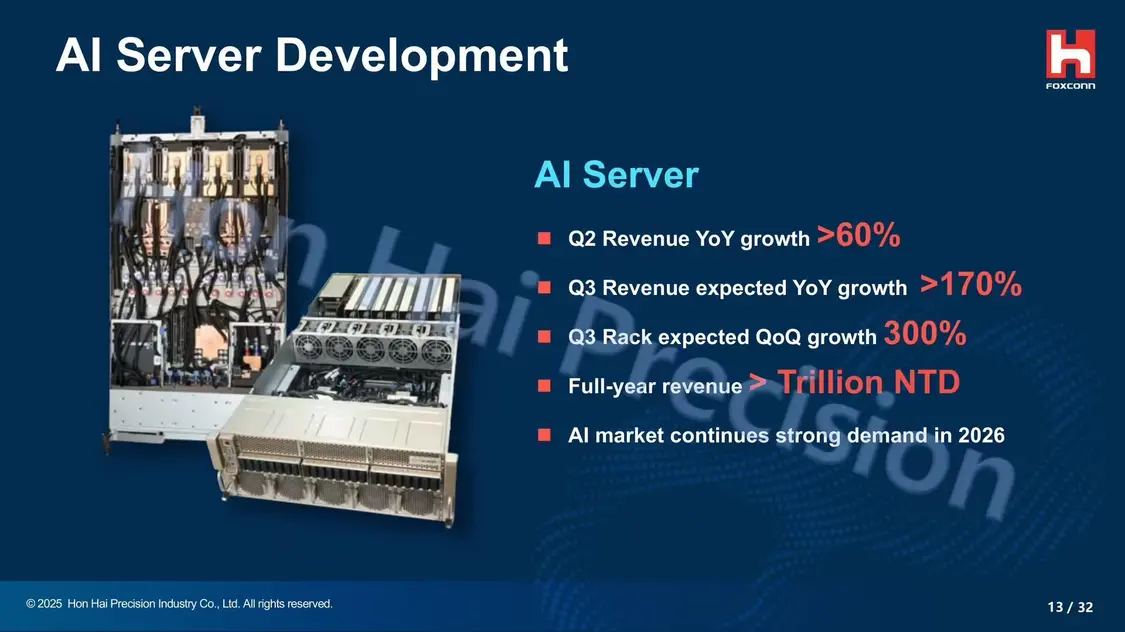 其輪值 CEO 楊秋瑾在昨日的 2025 年第二季度法說會上表示,鴻海 AI 服務器業務持續強勁。該部分業務 Q2 營收同比增長 60+%,預計三季度營收同比增幅有望進一步擴大至 170+%,而全年 AI 服務器可貢獻超 1 萬億新臺幣(IT之家注:現匯率約合 2390.43 億元人民幣)營收。