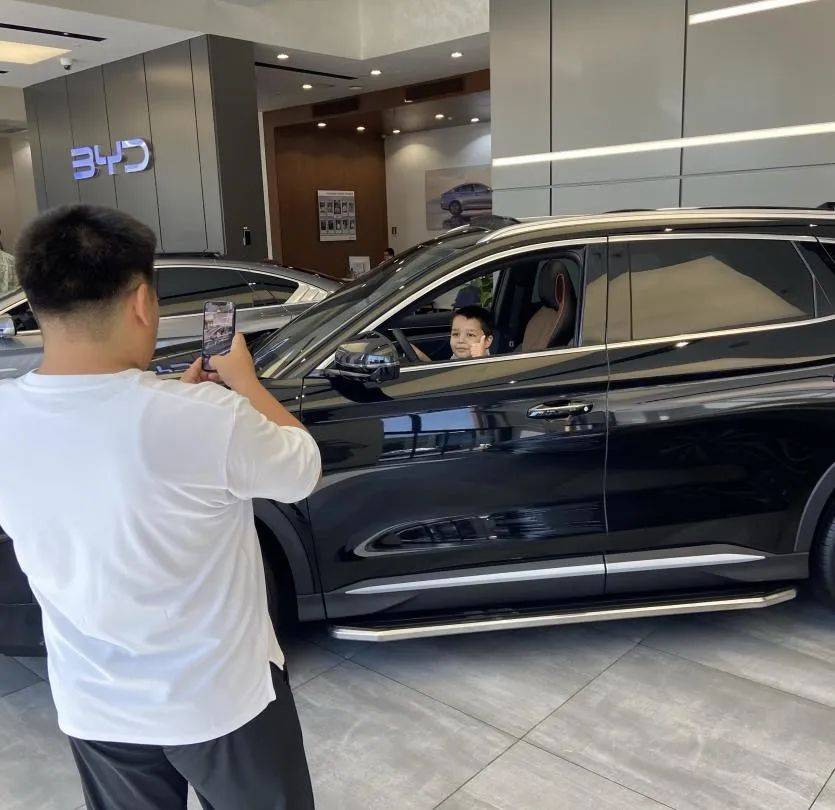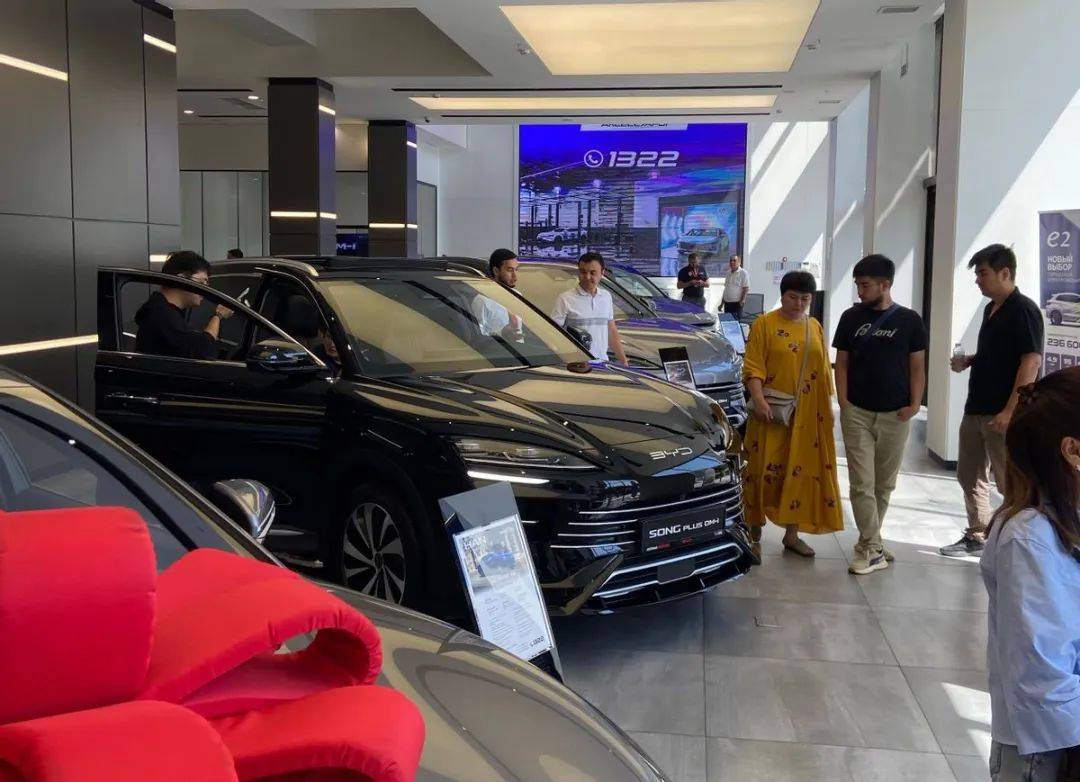 塔什干當地消費者在比亞迪4S店看車。據介紹,店里銷售的車型中9成都是插混,宋plus最多,占3成。