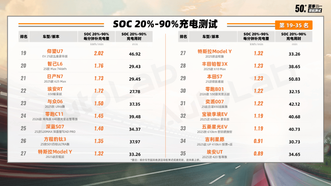 第一梯隊的選手每分鐘能充 2.9-2.6度,榜單中游的車型每分鐘的充入電量也基本保持在1.5度以上。