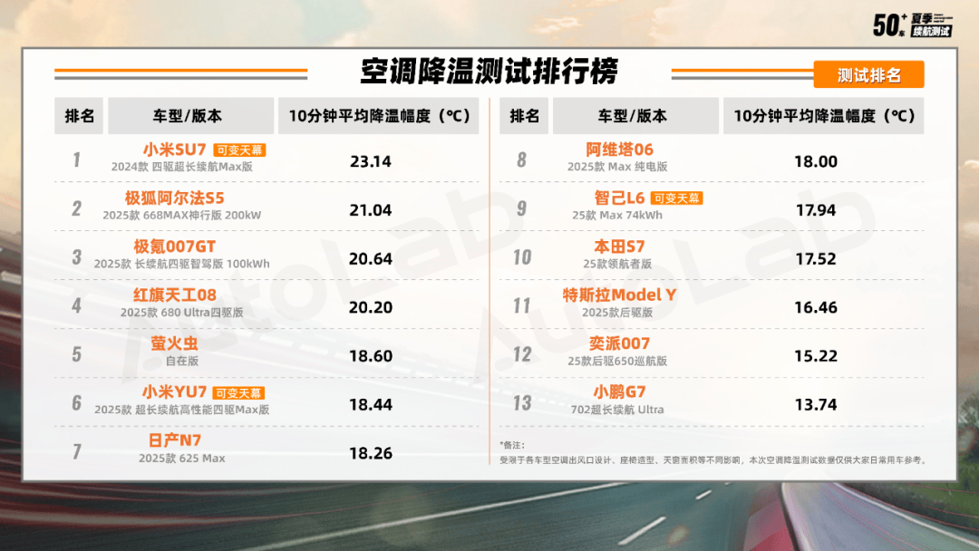 在計時十分鐘的降溫環節,榜單前列的幾位選手,平均降溫幅度都超過了20度,十分鐘之內車內的溫度就能降到體感舒適的溫區。