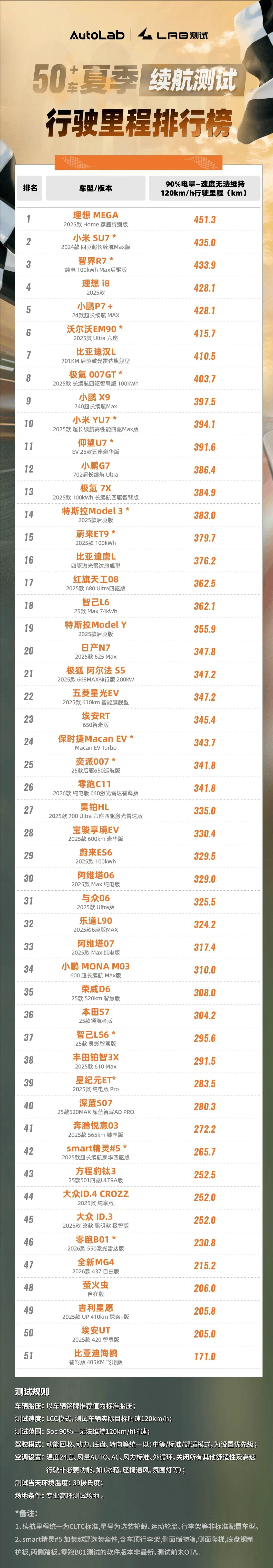 也就是說,如今市場上你能想到的主流汽車品牌、熱門的純電車型,在本次“51車夏季續航測試”上你都能看到。