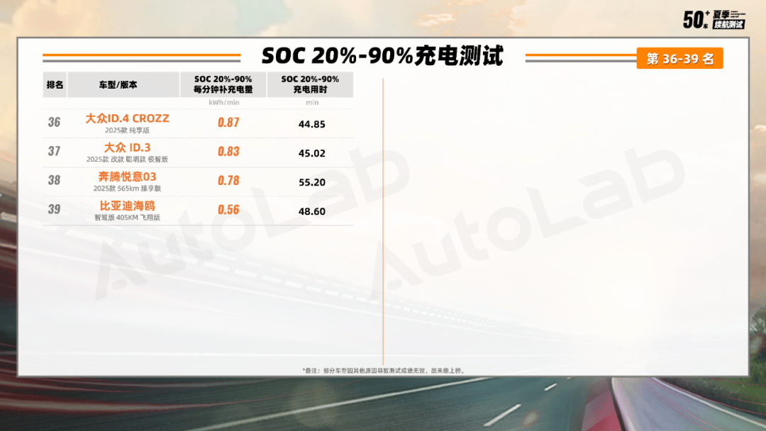 與之前的續航榜單相似,后半段的車型多為一些A級小型車。這類車型雖然電池容量普遍不大,但補能時間也基本在30-40分鐘,補能速度也基本是每分鐘1度電左右。