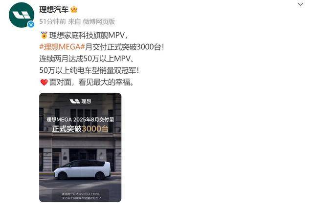 理想的MEGA同樣值得警惕。8月交付超3000臺,連續兩個月穩坐50萬元以上MPV和純電車型銷量冠軍。要知道,這個價格段的客戶極為挑剔,能拿下這塊蛋糕,說明理想在高端市場已立住腳。