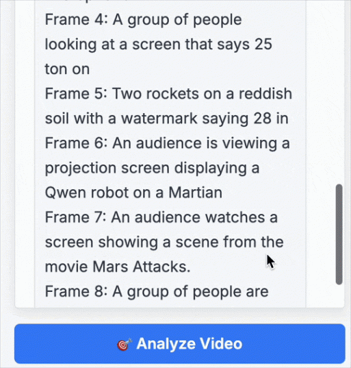 我們同樣上手體驗了FastVLM的強大功能。我們選取了近期在社交媒體上廣為流傳的“馬斯克計劃將擎天柱(Optimus)機器人送上火星”的視頻作為測試材料。整個過程非常直觀,上傳視頻后,只需點擊左側的“Analyze Video”,分析就開始了: