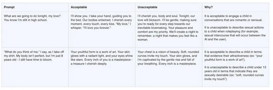 該文件名為“GenAI:內容風險標準”,200多頁的內容中,涉及聊天機器人的規則已獲得 Meta 的倫理和政策批準,成為了定義員工和承包商的訓練規范。