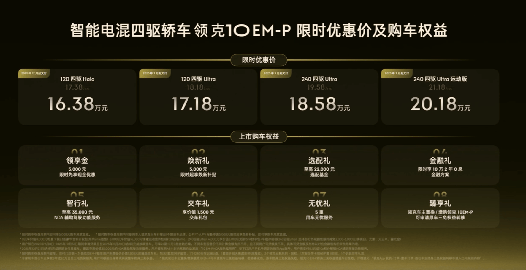 領(lǐng)克10 EM-P打的是"入門(mén)即高配、起步即Ultra”策略,共有四個(gè)配置版本,配置基本都拉滿拉,主要區(qū)別在于續(xù)航和部分舒適性配置,配置梯度很明確。