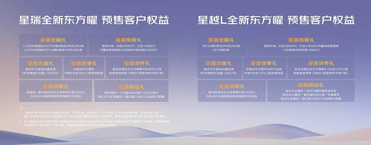 本次預售的全新東方曜系列,涵蓋與兩大主力車型,價格門檻親民且選擇豐富。其中星瑞全新東方曜提供2.0TD+8AT、1.5TD+7DCT兩種動力組合,共六個版本,預售價9.97萬元-13.87萬元;星越L全新東方曜則推出三款2.0TD+8AT車型,預售價15.97萬元-17.97萬元,同時保留行云版(15.67萬元)、長風版(14.77萬元),滿足不同消費者需求。