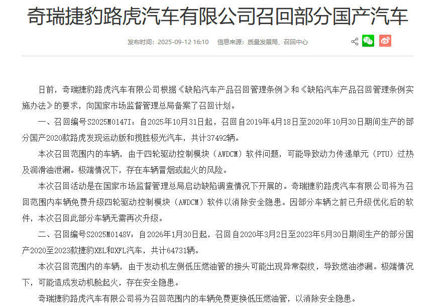 日前,市場(chǎng)監(jiān)管總局發(fā)布消息,表示奇瑞捷豹路虎汽車根據(jù)相關(guān)規(guī)定召回自2019年4月18日至2020年10月30日期間生產(chǎn)的部分國(guó)產(chǎn)2020款路虎發(fā)現(xiàn)運(yùn)動(dòng)版和攬勝極光汽車,共計(jì)37492輛。以及自2020年3月2日至2023年5月30日期間生產(chǎn)的部分國(guó)產(chǎn)2020至2023款捷豹XEL和XFL汽車,共計(jì)64731輛。