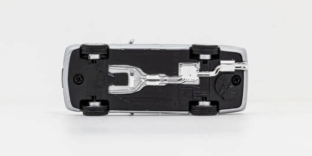 模型的懸掛高度較高,由于采用了彈簧懸掛,模型出現了后懸掛翹高的情況,和左右傾斜的問題,希望廠家改變工藝或者提高品控水準,畢竟這個檔次的模型,也沒必要做彈簧懸掛功能;模型的輪轂均為銀色的大餅式輪轂,輪轂的質感不錯,條幅較粗,輪轂中間通過浮雕表現出螺絲孔,螺絲孔中間還移印了奔馳的標志,剎車系統是忽略的,畢竟大餅輪轂也看不到。