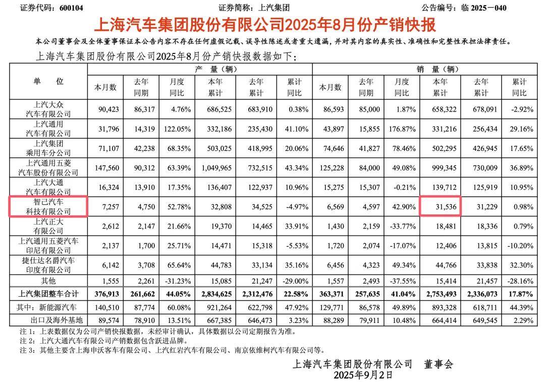 你看上汽集團(tuán)9月初公布的8月份產(chǎn)銷(xiāo)快報(bào):今年前八個(gè)月,智己只賣(mài)出了3.15萬(wàn)輛,是上汽集團(tuán)國(guó)內(nèi)整車(chē)業(yè)務(wù)板塊中銷(xiāo)量占比最低的品牌。