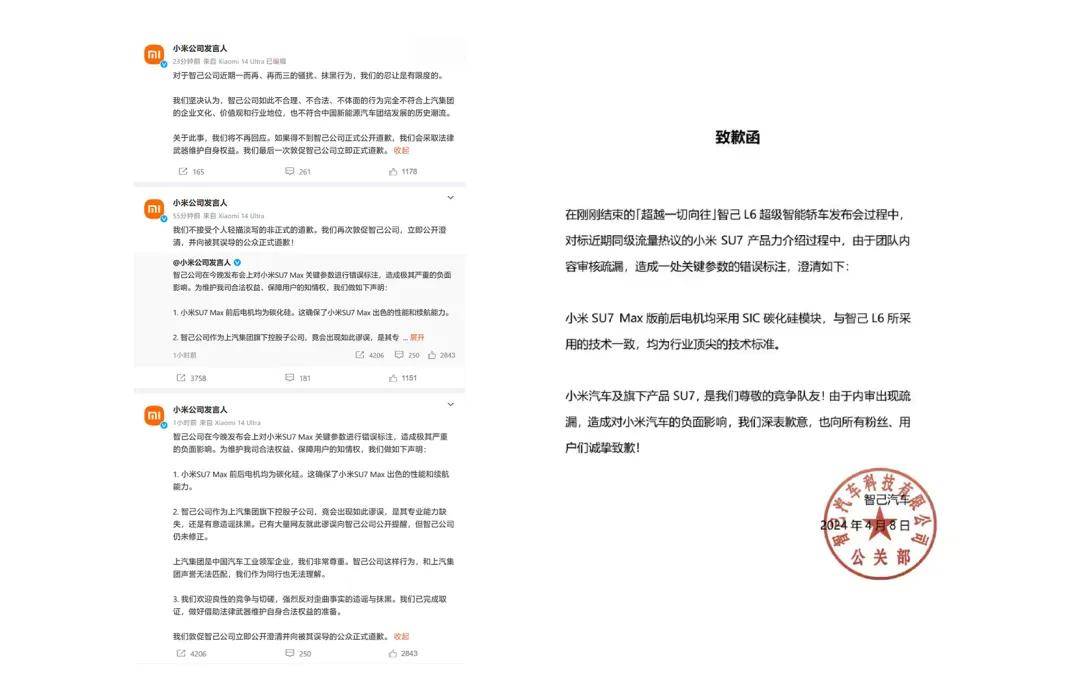 去年4月初,智己L6 發(fā)布會(huì)因錯(cuò)誤標(biāo)注了小米SU7電機(jī)信息,被小米汽車(chē)連發(fā)3條微博要求道歉。