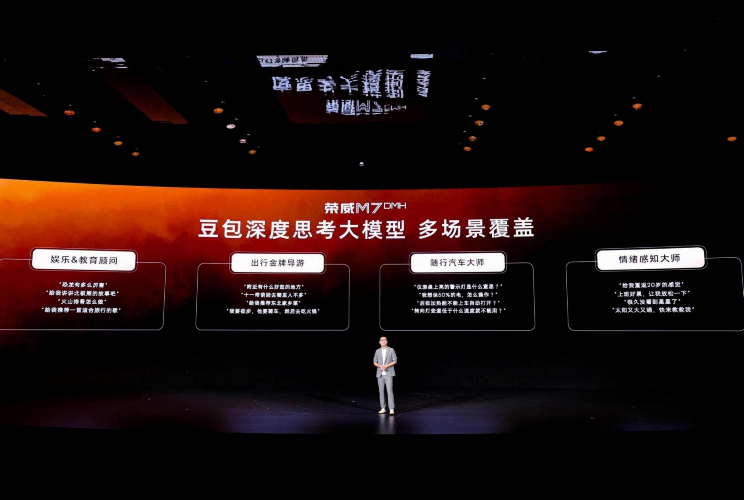 俞經民用了四個“平權”形容榮威M7 DMH這款車:用戶的第一輛豪華車,做到顏值平權、豪華平權、科技平權和智能平權。尤為值得關注的是在智能方面,榮威M7 DMH全球首搭豆包深度思考大模型。