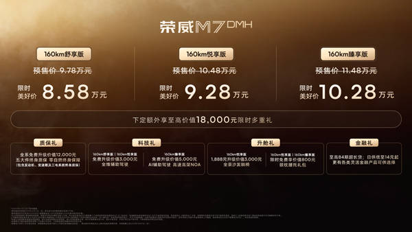 價格上,作為一款近5米車長、滿油滿電最大續航2050公里的中大型混動轎車,榮威M7 DMH售價僅8.58萬-10.28萬元。相比預售價還低了1.2萬元。