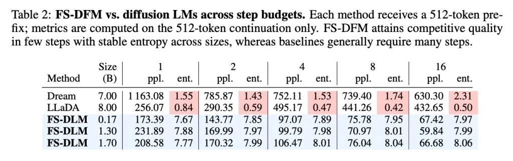 在性能評估中,FS-DFM 還支持對比了擁有 70 億參數的 Dream 模型和 80 億參數的 LLaDA 模型。測試結果顯示,即使是參數量僅為 1.7 億至 17 億的 FS-DFM 變體,在困惑度(衡量文本準確與流暢性的指標,越低越好)和熵(衡量模型選詞置信度的指標。熵太低,生成的文本可能單調重復;熵太高,則可能胡言亂語)兩項關鍵數據上,都表現出更低的困惑度和更穩定的熵。