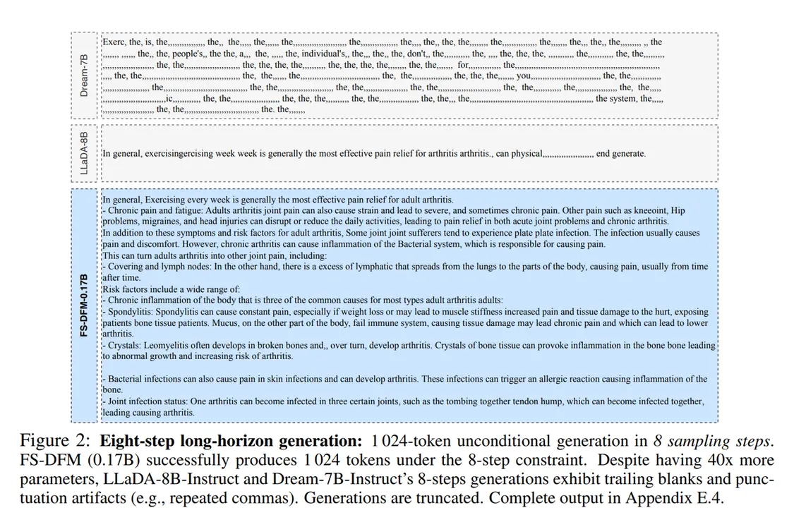 該模型專注于解決長文本生成領域的效率瓶頸,僅需 8 輪快速精練,就能生成高質量的長篇文本,其效果足以媲美傳統擴散模型執行上千步迭代所實現的效果。