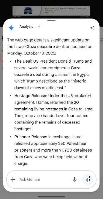 此時(shí)屏幕底部會(huì)彈出“頁(yè)面工具”菜單,用戶選擇帶有 Gemini 標(biāo)志的“詢問(wèn) Gemini”(Ask Gemini)選項(xiàng),隨后在彈出的 Gemini 界面中點(diǎn)擊“總結(jié)”按鈕,即可獲得當(dāng)前頁(yè)面的內(nèi)容摘要。