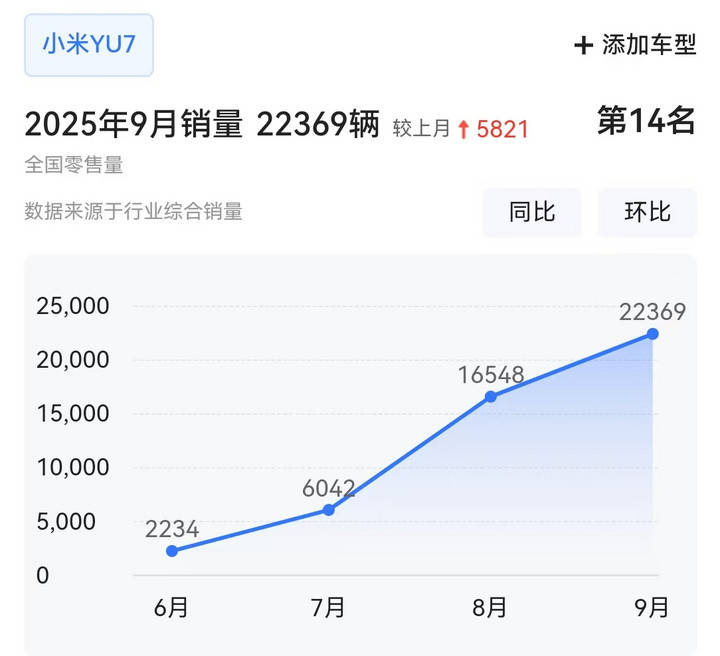 9月,小米YU7以22369輛的銷量環比激增35.2%,首次超越問界M8(21244輛,環比下降 1.4%),躋身乘用車零售TOP15,成為新能源市場又一 “黑馬” 車型。