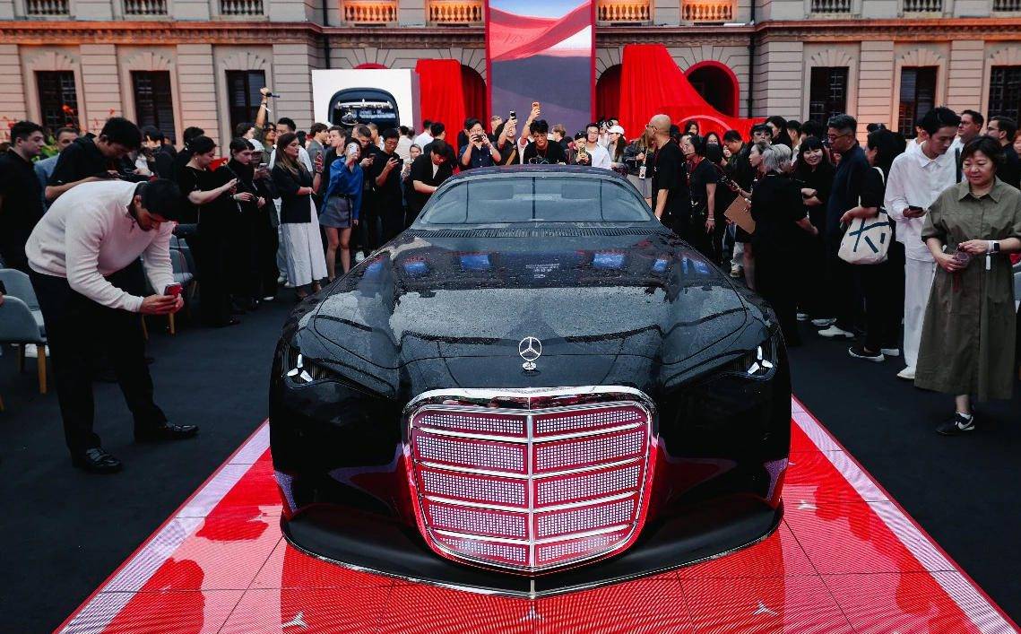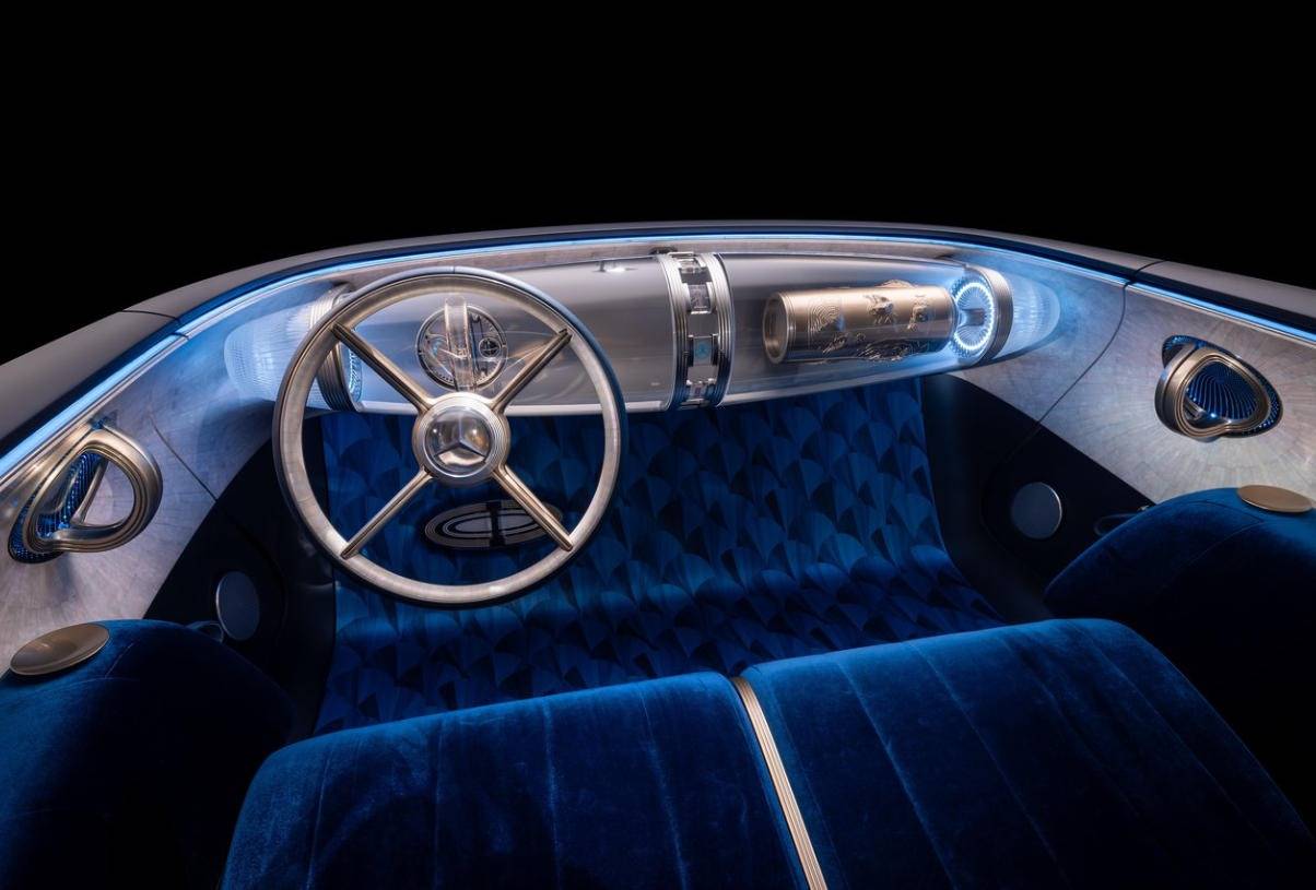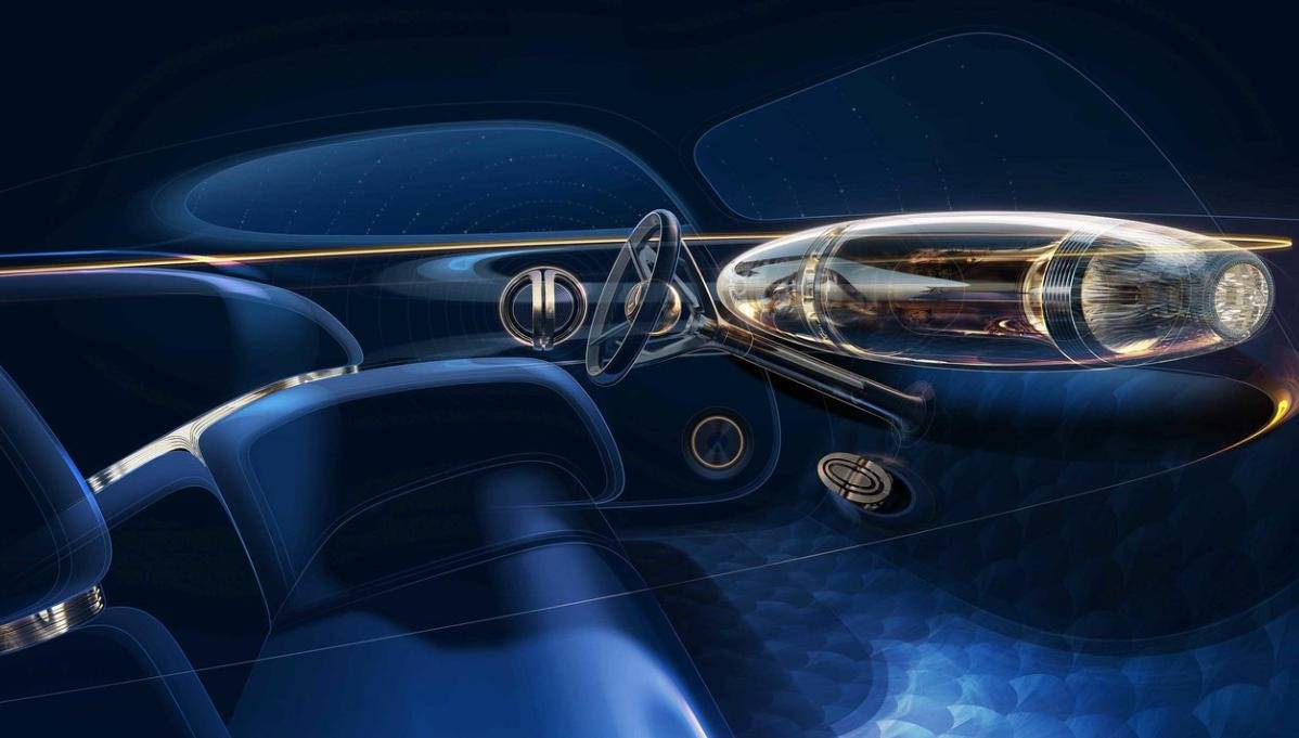 這款車并沒有堆砌屏幕,而是把老物件的精致感和現(xiàn)代科技混搭在一起,比如把深海貝殼做成了裝飾板,光線一照,泛出不同顏色的光,車門也用這種貝殼材質(zhì),紋路環(huán)繞著金屬門把手。前排座椅是一張寬大的藍色天鵝絨長沙發(fā),車輛的地板采用了17世紀流傳下來的麥稈鑲嵌手藝,工匠們需要把麥稈一點點拼成幾何圖案。