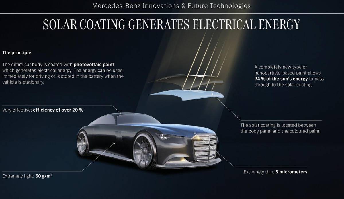 太陽能技術一直是奔馳在研究的方向,此前VISION EQXX概念車就采用了太陽能車頂,搭載117個太陽能電池板,但新一代技術將全車變成太陽能吸收器。如果陽光充足,這套系統(tǒng)單日能增程25公里,收集的太陽能儲存在一個輕質(zhì)磷酸鐵鋰電池中,為空調(diào)、燈光、信息娛樂系統(tǒng)和其他輔助設備供電。