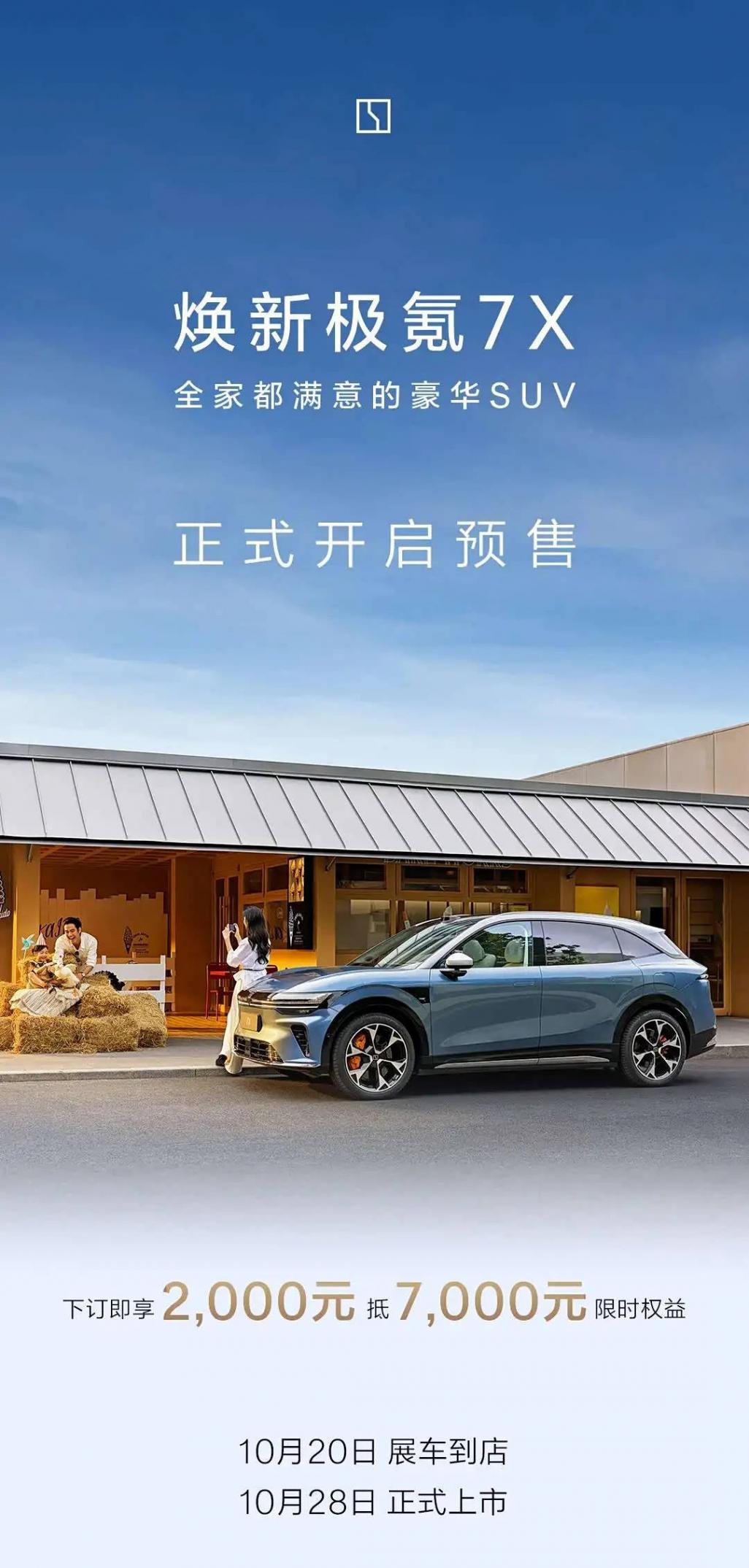 10月20日,我們從官方獲悉,新款極氪7X開啟預售,共推出75度后驅 Max版、103度后驅 Max版、103度四驅 Ultra版三個版型,下訂即享2000元抵7000元限時權益。目前展車已經到店,將于10月28日正式上市,并同步開啟交付。新車采用900V高壓架構,性能全面升級,配備Thor芯片以及千里浩瀚輔助駕駛H7,最大續航里程(CLTC)802km。
