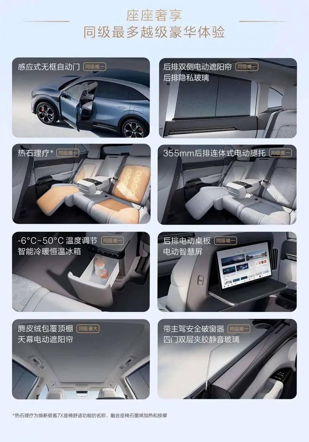 內飾方面,新款7X(參數|詢價)新增黑紫和黑橙兩款內飾配色。車輛基于SEA浩瀚架構,以4825mm的車身長度實現2925mm軸距,配合863mm短前懸設計,座艙得房率超過83.34%。同時,車輛還擁有1021mm頭部空間與1187mm腿部空間以及905L后備廂空間。全車共40處儲物空間。配置方面,車輛配備后排雙側電動遮陽簾/隱私玻璃,-6℃-50℃溫度調節的冷箱箱、后排電動桌板/電動智慧屏等。