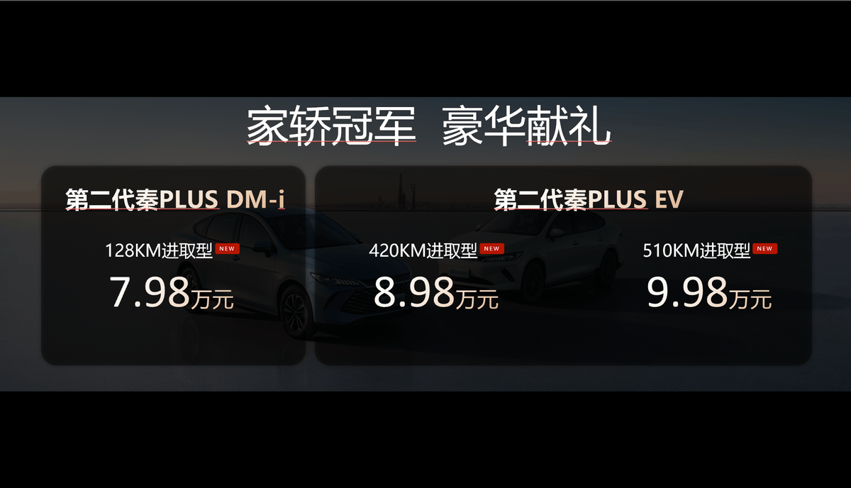 2025年10月17日,比亞迪王朝網“進取加推 粵領新程”第二代秦PLUS、秦L EV上新加推發布會在廣州隆重舉行,價格方面,第二代秦PLUS DM-i 128KM進取型售價7.98萬元,EV 420KM/510KM進取型分別為8.98萬元和9.98萬元;秦L EV限時狂歡價低至10.98萬元起,頂配云輦型為12.98萬元,并同步推出五重購車禮遇,誠意十足。
